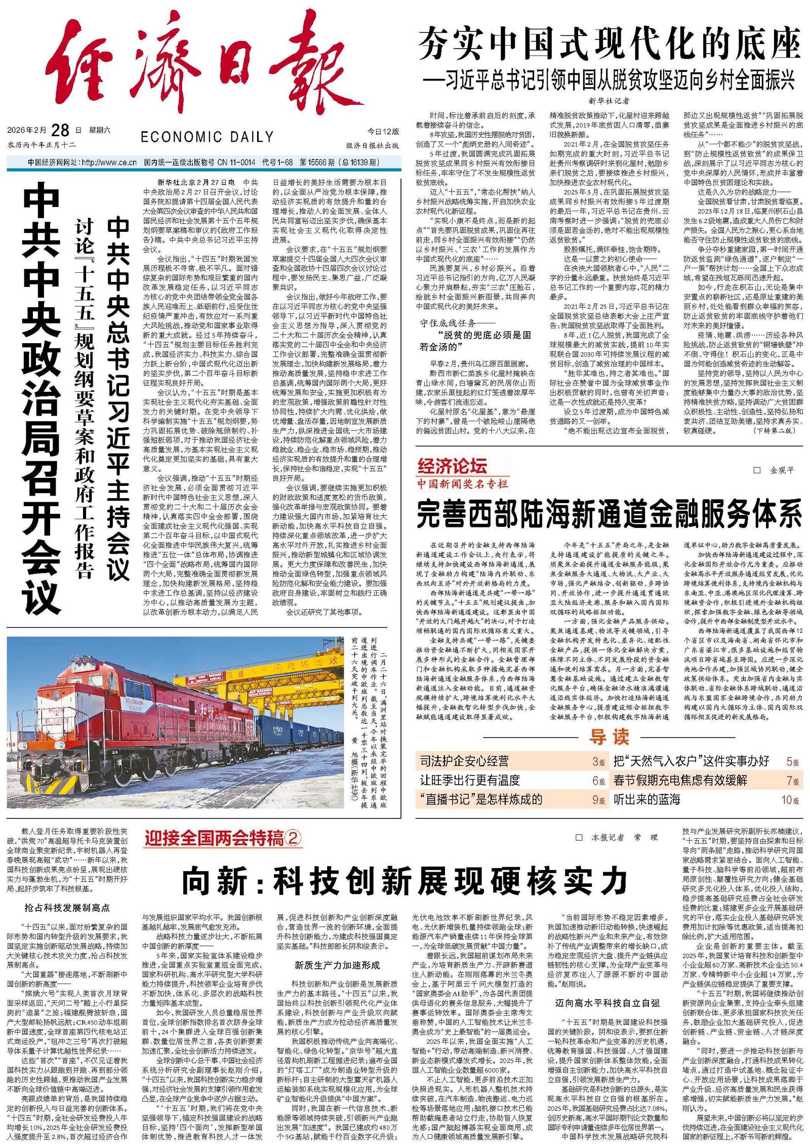 新华社北京2月27日电 中共中央政治局2月27日召开会议,讨论国务院拟提请第十四届全国人民代表大会第四次会议审查的中华人民共和国国民经济和社会发展第十五个五年规划纲要草案稿和审议的《政府工作报告》稿。中共中央总书记习近平主持会议。