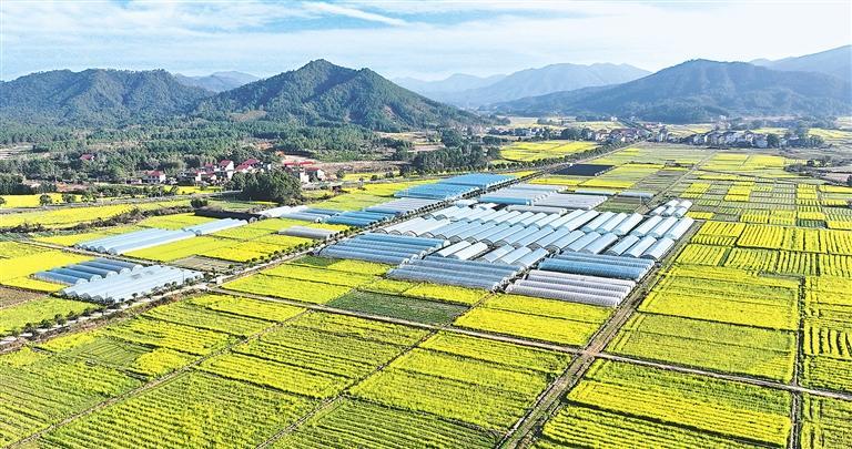 2月28日,江西省吉安市永丰县古县镇五团村,油菜花田与产业大棚、民居、青山相映成景。近年来,当地持续推进全域土地综合整治,助力粮油生产,打造蔬果产业园,促进农业增效、农民增收。刘浩军摄(中经视觉)
