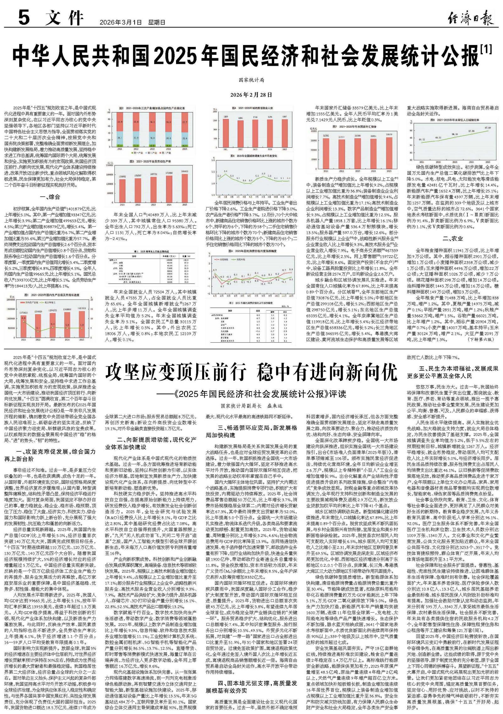 2025年是“十四五”规划收官之年,是中国式现代化进程中具有重要意义的一年。面对国内外形势深刻复杂变化,以习近平同志为核心的党中央领航掌舵、统揽全局,统筹国内国际两个大局,统筹发展和安全,坚持稳中求进工作总基调,实施更加积极有为的宏观政策,纵深推进全国统一大市场建设,推动我国经济顶压前行、向新向优发展,“十四五”圆满收官,第二个百年奋斗目标新征程实现良好开局。最新发布的《2025年国民经济和社会发展统计公报》是一年来非凡发展历程的缩影,镌刻着党中央团结带领全党全国各族人民迎难而上、砥砺奋进的坚实足迹,反映了中国经济聚力迎变局、斩棘破风浪的宝贵成果,以权威翔实的数据全景展现中国经济“稳”的格局、“进”的势头、“韧”的特性。