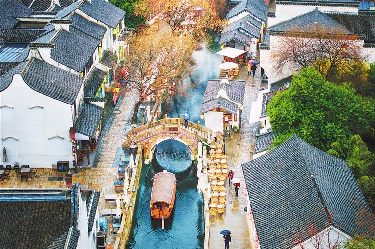 3月1日,游客在江苏省无锡市梁溪区的惠山古镇赏景游玩。当日,古镇内大红灯笼挂满廊棚,水巷里摇橹船往来穿梭,丰富多彩的活动吸引了不少游客。张明伟摄(中经视觉)