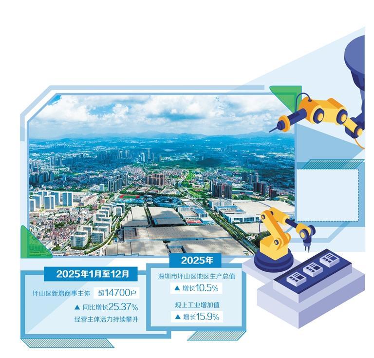 在产业空间保障方面,坪山区推进产业空间抽检与土地整备两个“三年行动计划”,将推出“三生融合”“三创结合”“三个平衡”的优质产业空间,通过租金优惠、智慧化设施配套等举措,为企业提供高品质低成本载体。在企业服务方面,坪山区创新打造区级企业服务综合平台,建立区街服务企业机制,推出“坪山益企行”“政企直通车”等举措,实现产业、科创、人才、资金事项全流程网上办理,提升服务效率。2025年1月至12月,坪山区新增商事主体超14700户,同比增长25.37%,经营主体活力持续攀升。