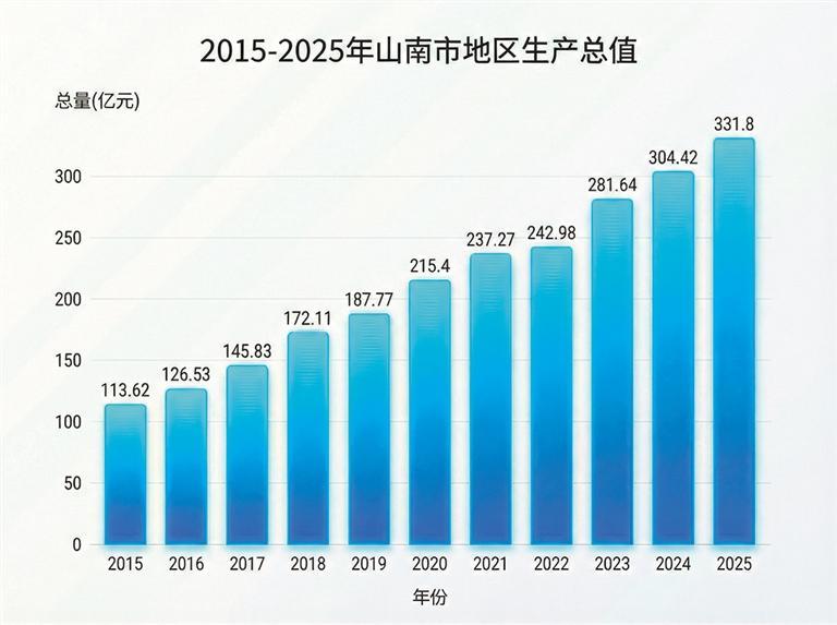 撤地设市10年,是山南经济提质增效、发展实力稳步攀升的黄金10年。从2015年地区生产总值113.62亿元,到2025年达到331.8亿元,经济总量稳步跨越,发展底盘坚实厚重。特别是“十四五”时期,山南地区生产总值年均增长6.1%,累计完成固定资产投资突破千亿元,公路通车里程达9839公里,交通路网四通八达,基础设施联通全域。农村自来水普及率、行政村道路通畅率、5G网络通达率分别提升至91%、100%、98%,现代发展根基全面夯实。特色农牧业提质增效,藏鸡、藏猪、核桃、葡萄、苹果等特色产业连片集聚、规模发展,2家企业获评农业产业化国家重点龙头企业。清洁能源乘势而上,已建在建电力装机与发电量较“十三五”时期实现翻番,绿色能源优势加速转化。工业经济稳步壮大,累计新增规上企业19家,规上工业增加值年均增长7.2%,产业结构持续优化升级。文旅产业蓬勃兴盛,累计接待游客3287万人次、旅游总花费133亿元,文旅融合活力迸发。营商环境持续优化,招商引资累计到位资金327.65亿元,援藏项目165个落地见效,多方合力赋能发展,产业兴城动能澎湃不息。