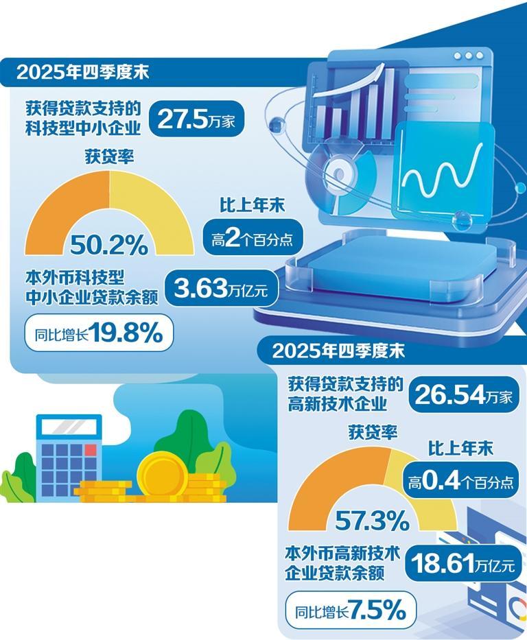 我国信贷资金加快浇灌科技创新沃土,服务科技型企业的覆盖面不断扩大。数据显示,2025年四季度末,获得贷款支持的科技型中小企业达27.5万家,获贷率为50.2%,比上年末高2个百分点。本外币科技型中小企业贷款余额达3.63万亿元,同比增长19.8%,增速比各项贷款高13.6个百分点。
