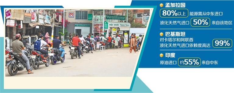 南亚国家对中东地区能源进口依赖较大,特别是绝大部分能源进口必经的霍尔木兹海峡受阻,直接威胁能源供应安全。作为南亚地区最大经济体的印度,原油进口约55%来自中东,每日进口量高达274万桶;巴基斯坦几乎所有原油进口都来自沙特、阿联酋等中东国家,对卡塔尔和阿联酋液化天然气的进口依赖度高达99%,对中东地区液化石油气进口依赖超过60%;孟加拉国80%以上能源需从中东进口,液化天然气进口50%来自该地区、液化石油气几乎100%依赖中东供应。如果考虑到该地区国家相对有限的战略石油储备规模,能源安全面临的挑战更大。