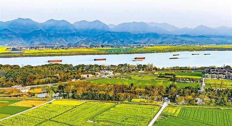 3月15日,富春江航道浙江省杭州市富阳区段,装载物资的船舶在江面上往来穿梭。计海新摄(中经视觉)