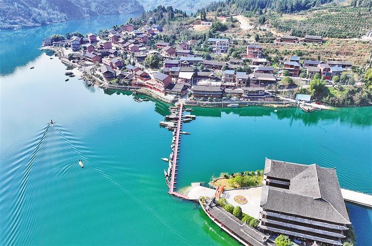 3月16日,重庆市酉阳土家族苗族自治县酉水河镇河湾村,土家族吊脚楼与一江碧水、两岸青山相映成趣。近年来当地持续加强生态治理,传统村落展现出人与自然和谐共生的美丽图景。冉 川摄(中经视觉)