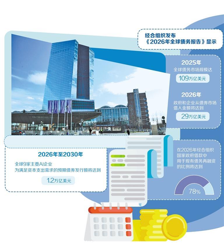 展望2026年全球债务市场,报告给出3个关键数字。一是29万亿美元。报告预计,2026年政府和企业从债券市场借入金额将再创纪录,达到29万亿美元,较2024年高出17%;二是78%。报告预计,在2026年经合组织国家政府借款中,用于现有债务再融资的比例将达到78%;三是1.2万亿美元。报告预计,2026年至2030年,全球9家主要人工智能(AI)企业为满足资本支出需求的预期债券发行额将达到1.2万亿美元。