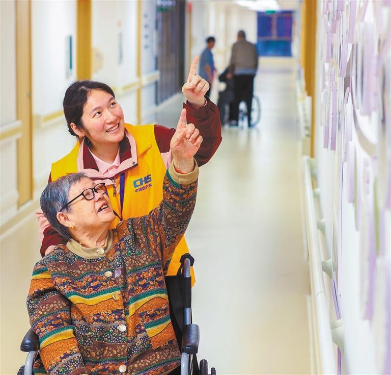 2025年11月11日,浙江省湖州市德清县德馨怡养院,护理员陪伴老人做记忆训练。