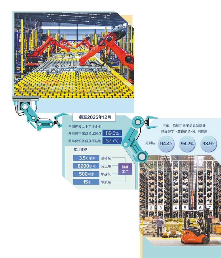 当前,我国制造业数字化转型覆盖广度明显提升,进入规模化普及阶段。中国信息通信研究院(以下简称“信通院”)前不久发布的《制造业数字化转型发展报告(2025年)》显示,截至2025年12月,全国规模以上工业企业开展数字化改造比例达89.6%,数字化设备普及率达到57.7%。累计建成3.5万余家基础级、8200余家先进级、500余家卓越级、15家领航级智能工厂。