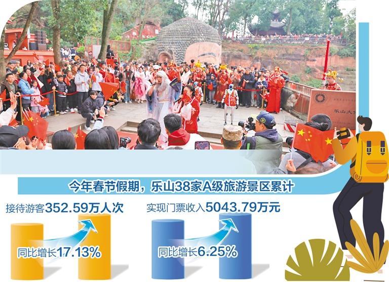 今年春节假期,乐山38家A级旅游景区累计接待游客352.59万人次,节日期间实现门票收入5043.79万元,分别较去年春节假期增长17.13%、6.25%。峨眉山、乐山大佛两大景区门票连续多日提前售罄,对全市A级景区门票收入增长的贡献率超88.78%。乐山以“新”作答、以“融”破题,全力提振文旅消费。