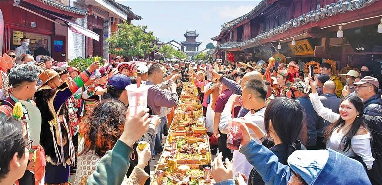 3月21日,第十三届大理巍山小吃节开幕式在云南大理白族自治州巍山彝族回族自治县举行。这是游客在品尝牛头宴。近年来,当地持续提升“中国名小吃之乡”品牌影响力,打造“食、游、购、娱”一体化的消费新场景。张树禄摄(中经视觉)