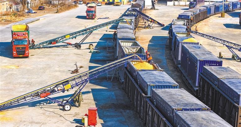 3月19日,哈尔滨铁路物流中心哈尔滨东营业部呼兰营业室的货场内,工作人员正在装运粮食。中国铁路哈尔滨局集团有限公司通过开行直达专列、优化多式联运,搭建高效物流网络,精准保障“北粮南运”。