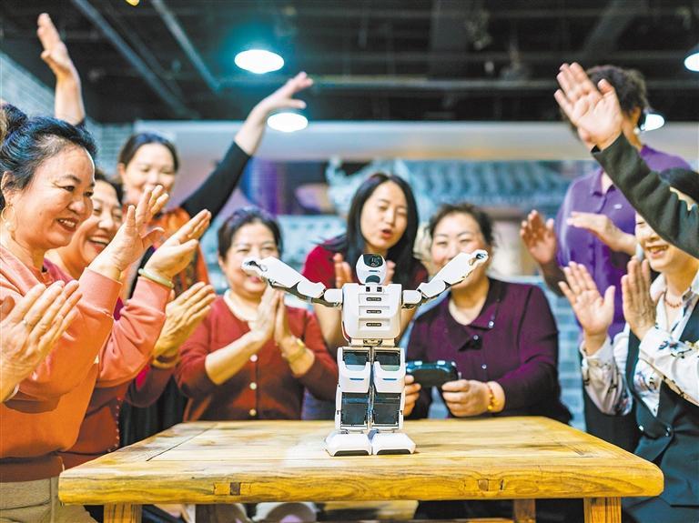 3月12日,市民在内蒙古呼和浩特市玉泉区老年大学智能应用课上与机器人互动。
