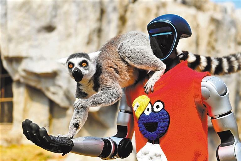 3月21日,山东省青岛森林野生动物世界,机器人“饲养员”在给环尾狐猴喂食。俞方平摄(中经视觉)