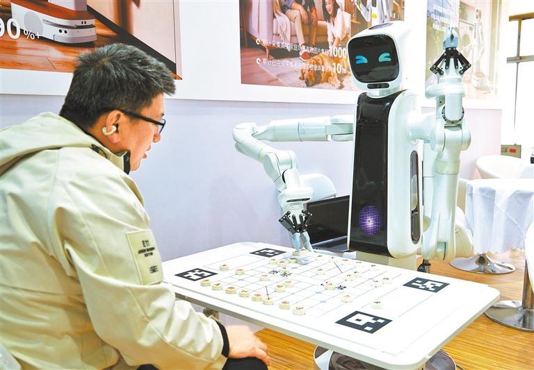 3月18日,AI Show 2026北京人工智能与机器人展在中国国际展览中心举办,观众在体验同机器人下棋。郭俊锋摄(中经视觉)