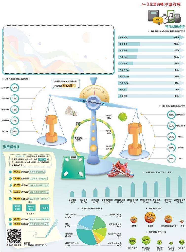 从相关数据看,体重管理相关食品饮品成交额保持较高增速。低卡零食、低脂零食、燃脂咖啡、无糖可乐等食品饮料成交额同比增速都超过200%。健身用品和体育用品成交额增长快。健身爬楼机、跳高训练器、滑雪机等器材,篮球服、体育服务等用品或服务成交额同比增速均超200%。这显示出体重管理消费市场增长潜力大。
