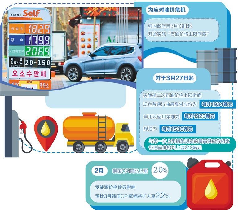 韩国政府应对油价危机最直接的手段是自3月13日起实施的“石油价格上限制度”。这是自1997年韩国油价自由化以来,政府首次采取如此强硬的价格干预措施。根据该制度,政府设定了燃油零售价格的上限。3月27日起,韩国政府实施第二次石油价格上限措施,规定普通汽油最高供应价为每升1934韩元、车用及船用柴油为每升1923韩元、煤油为每升1530韩元。与第一次上限措施规定的最高供应价相比,各油品价格均上调210韩元。