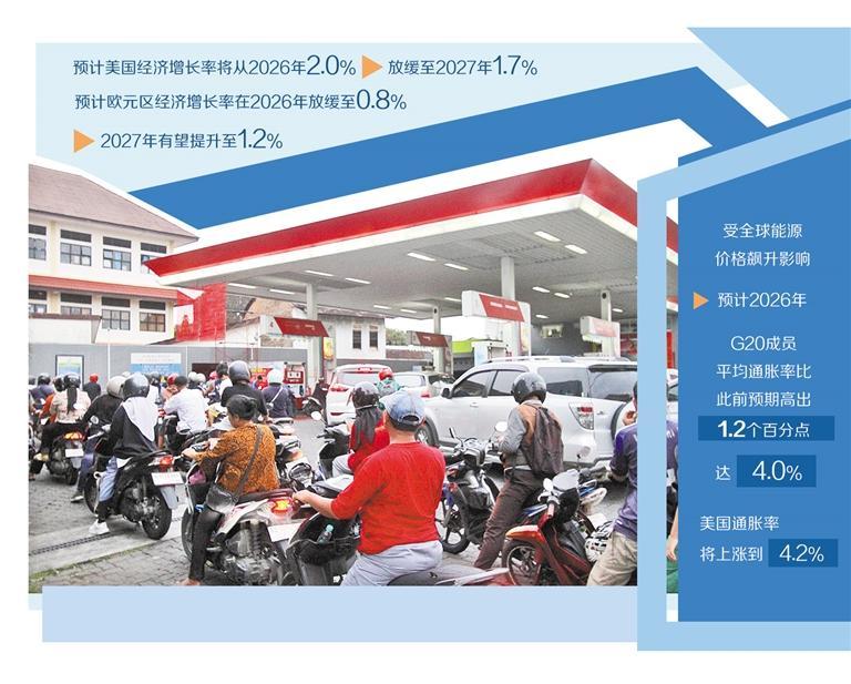 报告预计,能源价格上涨将延长全球通胀周期。受全球能源价格飙升影响,2026年二十国集团(G20)成员平均通胀率比此前预期高出1.2个百分点,达到4.0%,如果2027年能源价格压力能够逐渐消退,通胀将放缓至2.7%。G20发达经济体的核心通胀率预计将从2026年的2.6%降至2027年的2.3%。报告显示,能源价格上涨和供应链中断发生之际,巴西、墨西哥、土耳其、英国和美国等几个主要经济体的通胀率仍高于目标水平。预计2026年,美国通胀率将上涨到4.2%,如果主要经济指标恢复正常,2027年有望回落到1.6%。今明两年,日本通胀率分别为2.4%和1.9%,中国的通胀率为1.3%和1.1%。