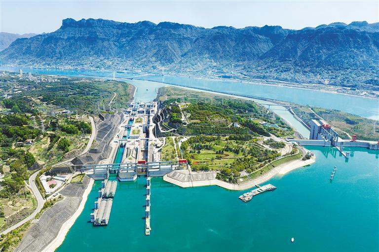 4月1日拍摄的三峡船闸和三峡升船机。数据显示,今年一季度,三峡枢纽累计运行3128闸(厢)次,累计通过量达3623.3万吨,共保障983.4万吨民生物资安全便捷过坝。