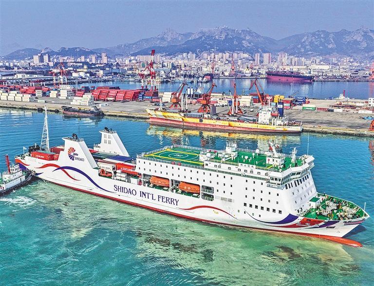 4月1日,山东省荣成市石岛管理区石岛新港口岸,满载跨境电商货物的“群山明珠”轮正靠港卸货。近年来,该管理区健全通关服务保障机制,全力保障货物通关高效顺畅,为跨境电商出口持续注入强劲动能,助推外贸新业态高质量发展。李信君摄(中经视觉)