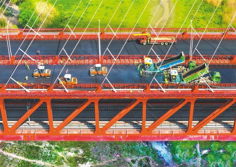 3月28日,安徽马鞍山长江公铁大桥施工现场,工人们进行桥面沥青铺摊作业。