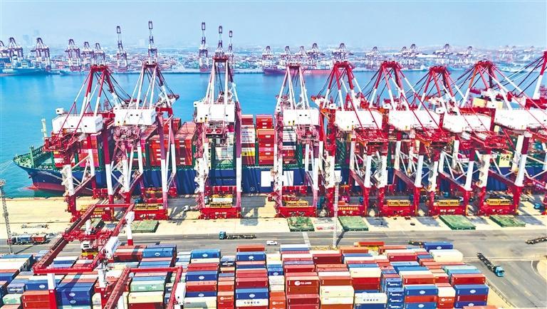 近日,在山东港口青岛前湾港区,一艘货轮在装卸货物。今年一季度,青岛港新增7条集装箱航线,持续稳固跨境供应链韧性。