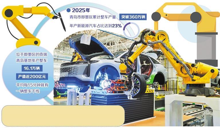 在即墨汽车产业的版图上,2025年是一个具有分水岭意义的时间节点。这一年,即墨累计整车产量突破360万辆,年产新能源汽车占比达到23%。一汽—大众华东基地、一汽解放商用车基地、一汽解放新能源轻卡和奇瑞青岛基地四大整车生产基地集聚于此,400余家零部件企业环绕分布。2025年,奇瑞青岛基地年产整车16.1万辆,产值近200亿元,平均每1.5分钟就有一辆整车下线,其中新能源汽车在产量和产值上均实现“双过半”。
