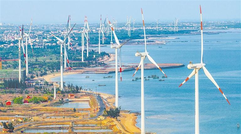 4月4日,广东省湛江市徐闻县角尾乡南极村海边,数十座白色风力发电机组源源不断输送绿色能源。