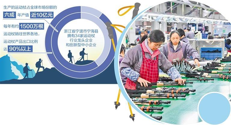 年生产1500万根,年产值近10亿元,占全球市场份额六成……在浙江省宁波市宁海县,一支看似普通的运动杖,正书写着从东海之滨走向世界舞台的传奇。在这里,聚集了一批知名的运动杖生产和出口企业。