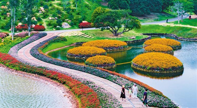 4月12日,游客在广西壮族自治区南宁市青秀山风景区丘石花园游玩赏花。近期,丘石花园鲜花盛开,绚烂多彩的花海吸引游客前来打卡。曾祥忠摄(中经视觉)