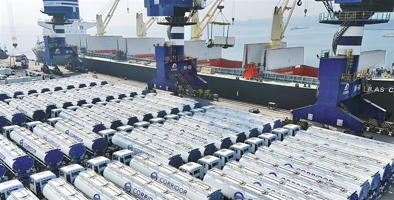 4月13日,出口科特迪瓦的车辆在山东港口烟台港装入中非班轮。数据显示,今年一季度,烟台港中非件杂货班轮航线发运量突破200万吨,同比增长31.9%,运输货种高度契合非洲国家基建和民生需求。唐 克摄(新华社发)