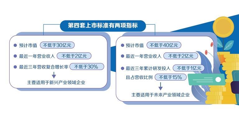 具体来看,第四套上市标准共有两项指标:一是“预计市值不低于30亿元,最近一年营业收入不低于2亿元,最近三年营收复合增长率不低于30%”,主要适用于新兴产业领域企业。二是“预计市值不低于40亿元,最近一年营业收入不低于2亿元,最近三年累计研发投入不低于1亿元且占营收比例不低于15%”,主要适用于未来产业领域企业。