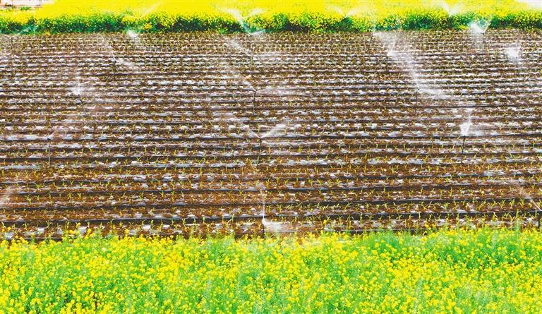 3月20日,位于四川德阳市旌阳区的黄土河农业专业合作社,节水喷灌设备正在对栽种的牛奶水果玉米苗进行喷灌作业。唐渝川摄(中经视觉)
