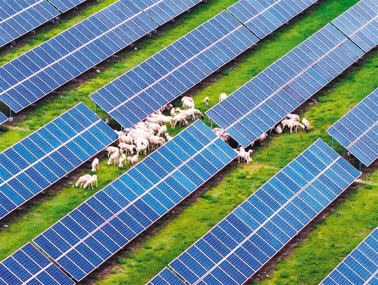 2025年8月4日,陕西榆林市砖井镇,羊群在光伏产业园里吃草。“板上发电、板下牧羊”让清洁能源、生态保护与畜牧养殖协同发展。周修建摄(中经视觉)