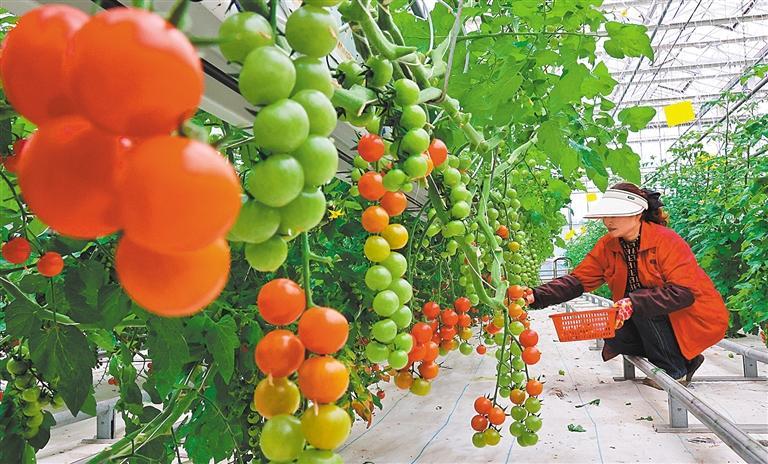 2月27日,江苏连云港市海州区浦南镇番茄庄园,工作人员在采摘小番茄。该基地利用无土栽培技术种植番茄,病虫害少、产量高、生产持续时间长。 耿玉和摄 (中经视觉)