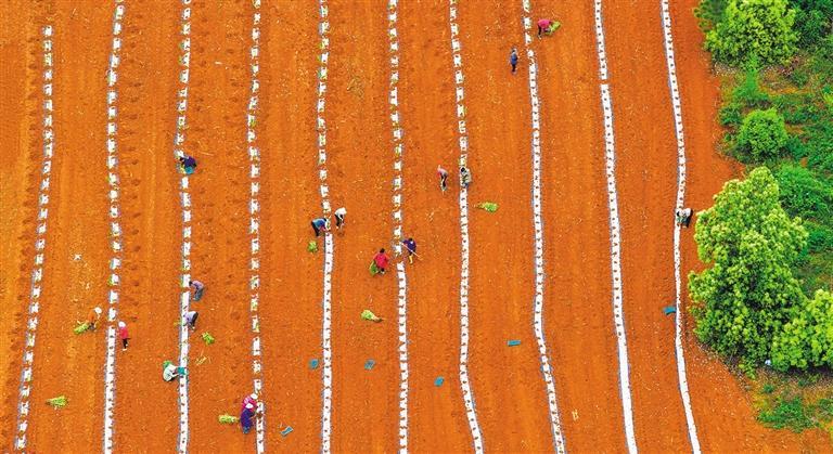 4月8日,江西樟树市义成镇淖港村,村民在田间栽种黄栀子苗和套种西瓜苗。当地大力发展中药材种植产业,推广“农业套种、生态循环”模式,扩大种植规模,提升农业效益。