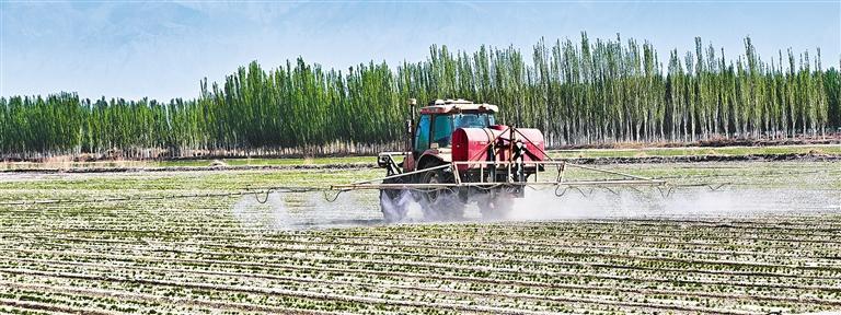 4月14日,新疆生产建设兵团第二师22团10连的小茴香田里,一台搭载北斗导航系统的喷雾农机正开展病虫害防治喷洒作业。谢江林摄(中经视觉)
