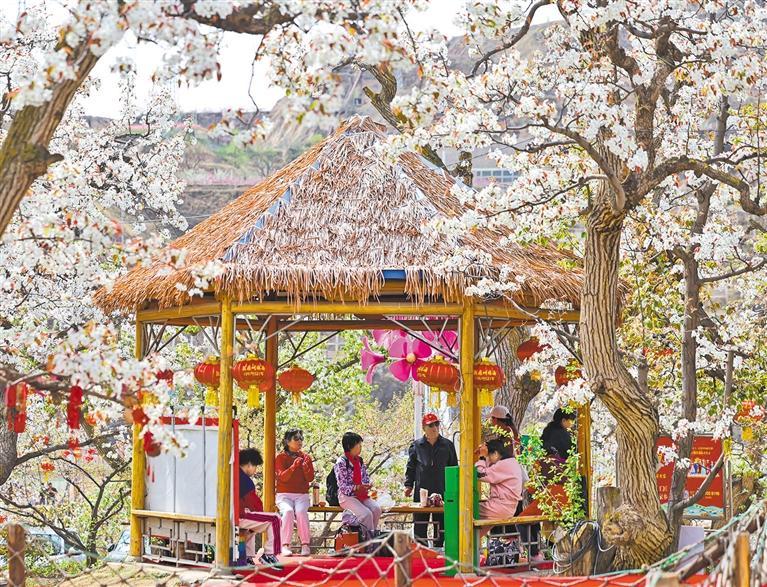 4月13日,游客在甘肃省兰州市皋兰县什川镇的古梨园踏青打卡。近年来,当地依托生态资源,打造梨花季等多元活动,推动农文旅深度融合,带动群众增收,为乡村振兴注入动力。