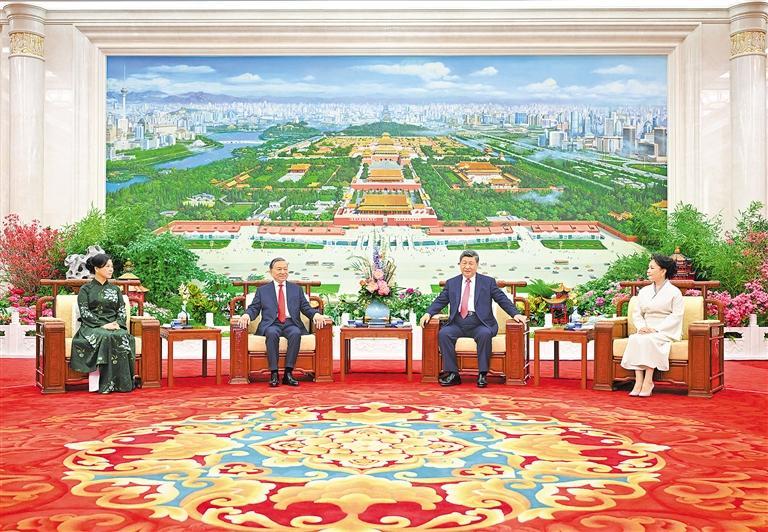 习近平说,今天,我同苏林总书记、国家主席就共同关心的全局性、战略性问题进行了长时间深入交流,达成许多新的重要共识。我突出感受到,中越都是社会主义国家,我们要继续沿着这条道路确定的方向坚定前行,做社会主义事业的命运共同体;我们是休戚与共的好邻居,正在共同奔向现代化,要做实现现代化的命运共同体;我们都主张天下大同,在世界百年变局下,要做推动构建人类命运共同体的伙伴。明天你将启程访问广西,再次进一步深入了解中国。我们愿同越方共同努力,引领中越命运共同体建设驶入高速发展的快车道。