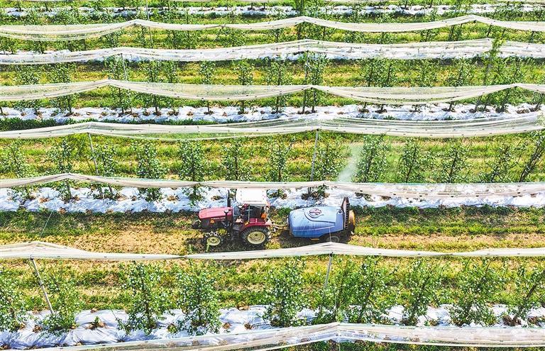 4月14日,山东省东营市广饶县大王镇一处苹果种植基地内,农民正驾驶农机进行植保作业。当下,正值苹果春季管护关键时期,广饶县抢抓农时,开展覆盖地膜、施肥除草等作业,为丰收打下基础。刘云杰摄(中经视觉)