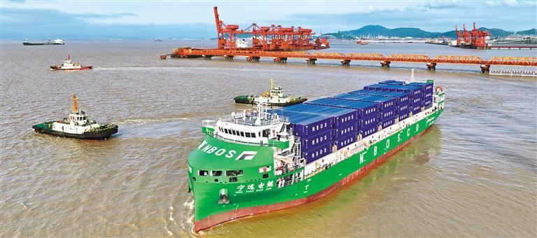 4月15日,“宁远电鲲”轮从宁波舟山港北仑港区启航,标志着我国沿海集装箱运输开启纯电驱动、智能领航新阶段。船舶采用10个标准化箱式电池作为核心动力,总储电量约2万千瓦时,投用后预计每年可节约燃油580吨,减少二氧化碳排放量超1400吨。卢小洲摄(中经视觉)