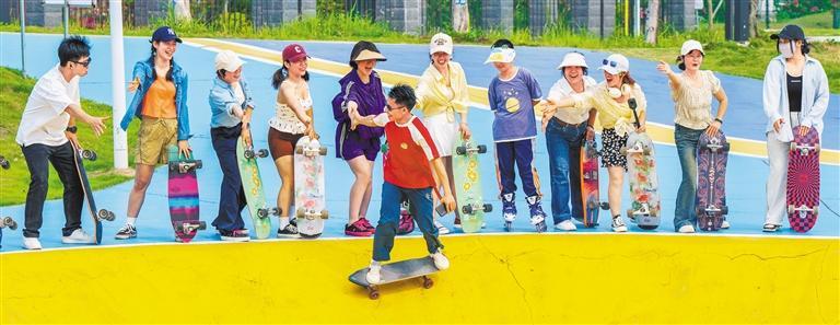 4月12日,广西壮族自治区梧州市苍海体育公园,市民在体验陆地冲浪板运动。何华文摄(中经视觉)