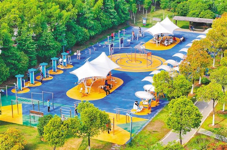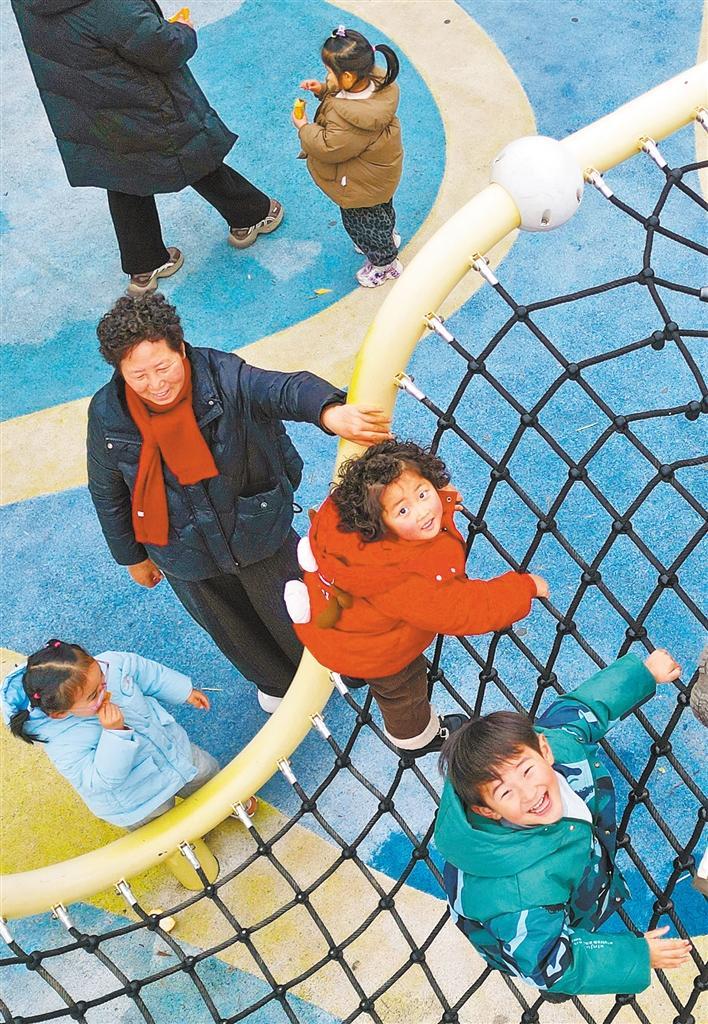 3月19日,江苏省东台市一社区口袋公园,小朋友在体验攀爬架等儿童游乐设施。该市通过增补儿童运动区、亲子休憩点、校外实践角等设施,推进公共空间适儿化改造。