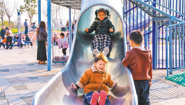 3月5日,河南省洛阳市伊滨区城市公园,小朋友在玩滑梯。各地持续推进口袋公园建设,盘活城区、集镇区和小区周边闲置空间,让居民推窗见绿、出门入园,在家门口享受生态之美。