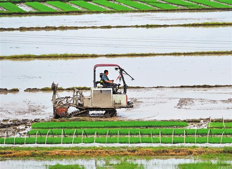 4月12日,湖南省邵阳市洞口县花园镇桂花村,农民驾驶耕田机翻耕水田。当前正值春耕生产关键期,洞口县农民抢抓农时,翻耕、施肥、插秧苗等,田间一派繁忙景象。