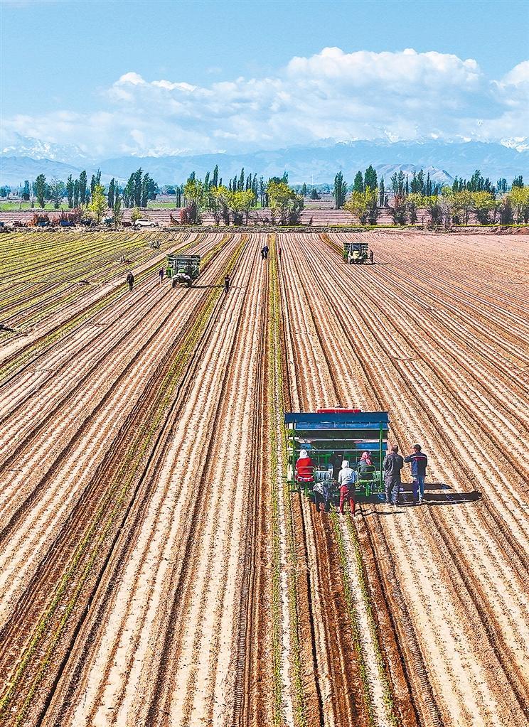 4月26日,新疆昌吉回族自治州呼图壁县园户村镇上三工村,番茄种植户驾驶移栽机在田间作业。近日,当地有序推进春耕工作,不断夯实番茄丰产丰收基础。陶维明摄(中经视觉)