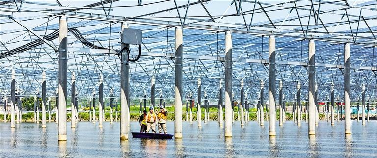 4月26日,江苏省海安市大公镇一处在建渔光互补光伏项目,国网南通供电公司工作人员在巡检光伏设施。近年来,当地大力推进渔光互补光伏项目建设,实现“水上发电、水下养殖”。